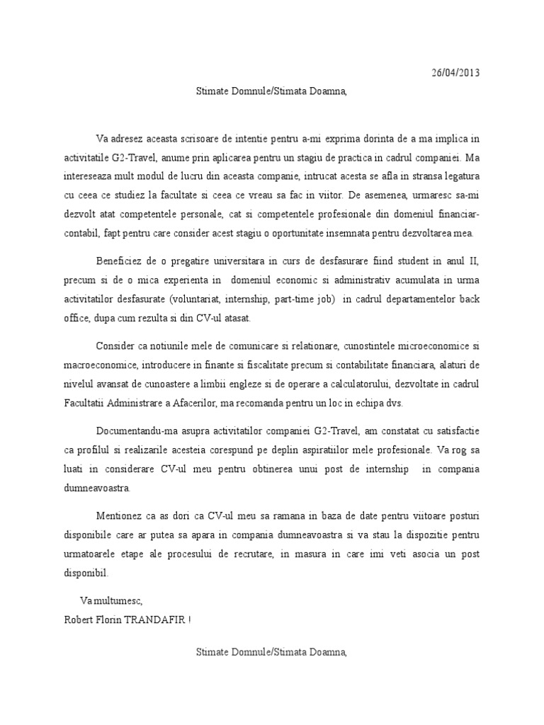 Scrisoare de intentie contabil. Model scrisoare de intentie contabil junior martie 2 2011 martie 2 2011 admin data stimate domnule stimata doamna va adresez aceasta scrisoare de intentie pentru a mi exprima dorinta de a aplica pentru postul de contabil junior in departamentul de contabilitate al companiei dvs care potrivit anuntului de angajare publicat pe hipo ro consider ca mi se potriveste. Am o experienta de peste trei ani in domeniul contabilitatii dintre care ultimii doi petrecuti in compania y unde am fost responsabil de efectuarea contabilitatii primare activitati fiscale curente precum si de indeplinirea la termen a obligatiilor societatii fata de bugetul statului in. Infunctie de profilul tau al companiei care ofera jobul si de preferinte alege cea maipotrivita scrisoare de intentie al treilea model de scrisoare de intentie stimat a domn doamna va prezint candidatura mea pentru postul de care am luat la cunostinta cu interes prinintermediul anuntului aparut pe site ul myjob. Model scrisoare de intentie contabil senior.