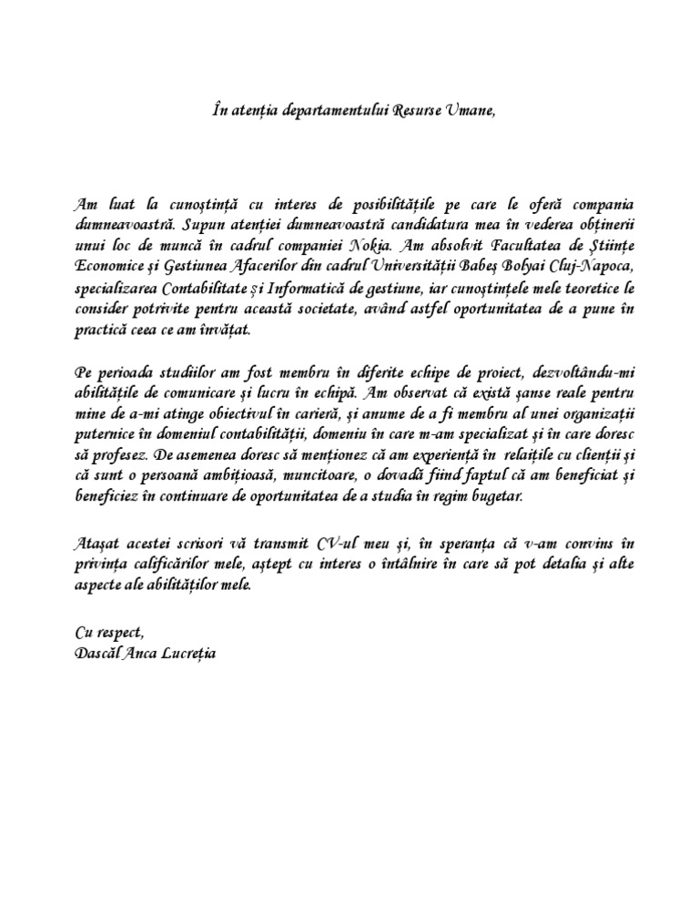 Exemplu de scrisoare de intentie. Va adresez aceasta scrisoare de intentie pentru a mi exprima dorinta de a aplica pentru postul de contabil senior publicat pe hipo ro de compania x.
