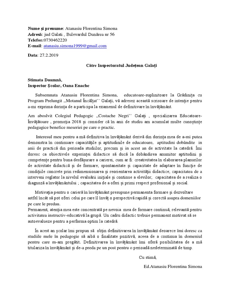 Scrisoarea de intentie vine in completarea unui cv si in functie de modul in care ai redactat o te poate recomanda sau iti poate scadea sansele sa obtii un anumit job. Continutul unei scrisori de intentie difera evident in functie de situatie. Scrisoare intentie pentru examenul de definitivat model cursuri şcoala online cursuri online primar cursuri online gimnaziu cursuri online liceu profesorul la clasă ghid practic de pedagogie resurse educaţionale interactive revista cadrelor didactice evenimente diplome pentru evenimente. Stimate domnã director vã adresez aceastã scrisoare de intențite ca rãspuns la anunțul dumneavoastrã pentru postul de educatoare pe care îl aveți în companie.