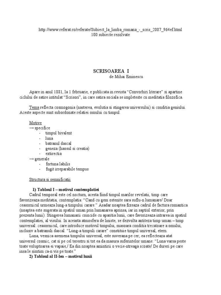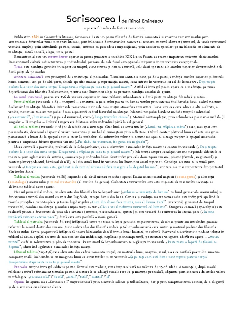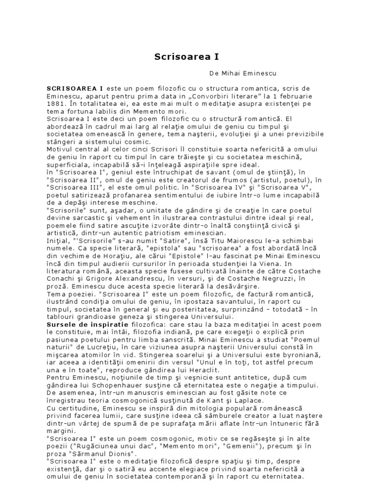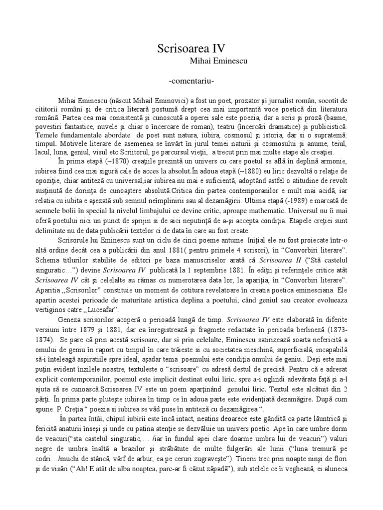 Comentariu la poezia scrisoarea 1 scrisă de poetul român mihai eminescu care tratează condiția omului de geniu într o operă eminesciană. Un comentariu lung de două pagini word la poezia scrisoarea i în care romantismul eminescian se evidențiază nu numai în operele din a doua etapă de creație ci și în capodoperele de dupa 1878. Scrisoarea ii 0 comentariu. Imaginile poeziei sunt organizate în două mari părţi aflate în antiteză trecut prezent.