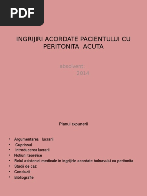 Studiu de caz apendicita acuta. 2 iunie 2013 data externarii. în cazul apendicitei acute trebuie să ne îndreptăm atenţia asupra copiilor şi vârstnicilor categorii de vârsta la care boala se manifestă diferit faţă de persoană adultă. Iti recomandam sa te uiti bine pe extras cuprins si pe imaginile oferite iar daca este ceea ce ti trebuie pentru documentarea ta o poti descarca. Apendicita acuta perforatie peritonita bacteriana hlg.