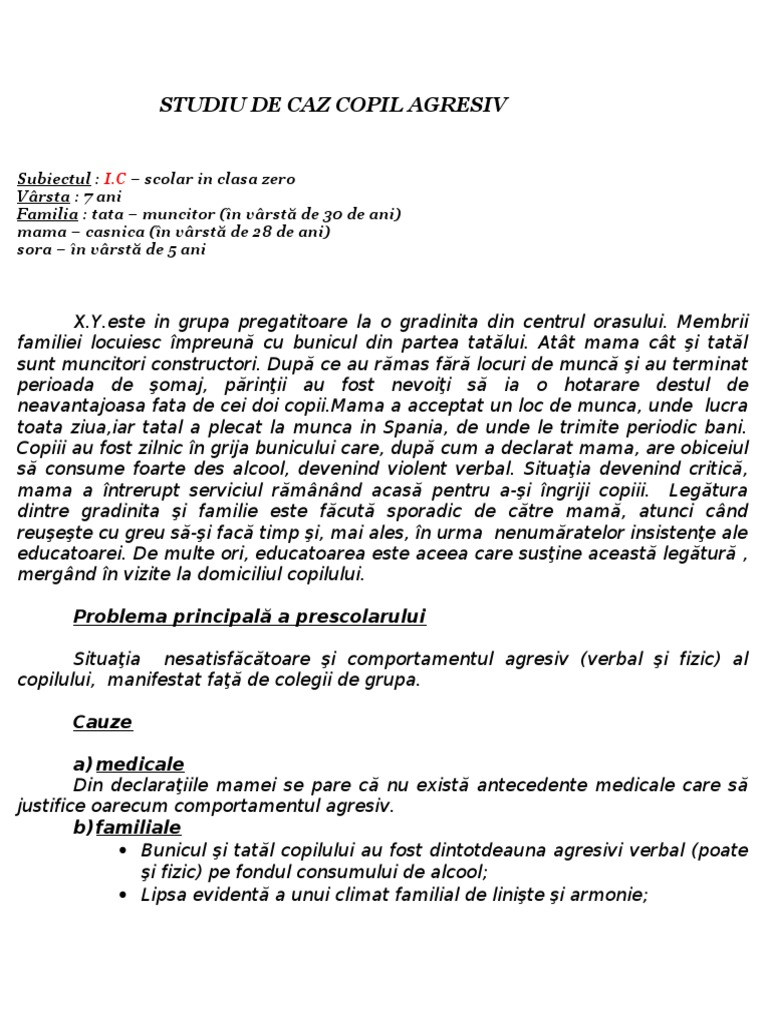 Studiu de caz copil agresiv. Studiu de caz descrierea problemei a situatiei analizate. Agresivitatea din pǎcate nu era acceptatǎ de cǎtre pǎrinṭi care nu puteau concepe cǎ aceste manifestǎri aparṭin copilului lor care acasǎ era foarte liniştit. Suceava am ales acest caz în urma unei situaţii alarmante generată de o realitate ce nu poate fi ignorantă nici la nivelul şcolilor și nici la nivelul întregii ţări. Iulie 22 2017 martie 11 2018.