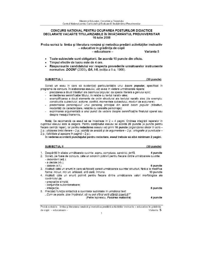 Subiecte storie definitivat 2019. Variantele modelele de subiecte precum și baremele de evaluare şi de notare elaborate în coordonarea centrului național de evaluare și examinare pentru toate evaluările examenele şi concursurile naționale nu pot fi preluate în vederea comercializării. Subiecte definitivat 2020 educatoare. Subiecte limba engleza definitivat 2019.