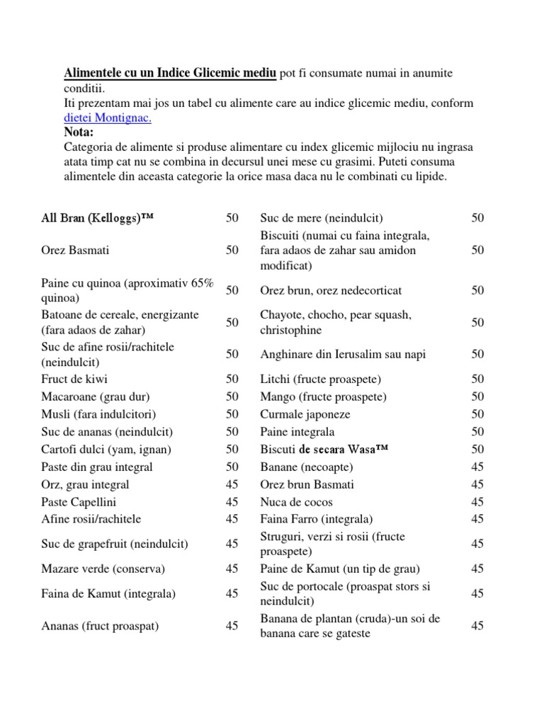 Lista alimentelor cu indice glicemic mare. Alimentele care au indice glicemic peste 70 trebuie consumate in cantitati reduse si intotdeauna asociate cu alimente cu indice glicemic mic. Intrucat alimentele cu indice glicemic redus au valoarea de 55 sau mai putin acest lucru implica o dieta cu indice glicemic scazut. Una din cele mai populare diete ale momentului este dieta montignac.