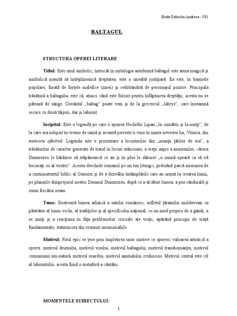 Baltagul roman interbelic obiectiv mitic tradițional. Baltagul tema si viziuneade mihail sadoveanu in perioada interbelica romanul romanesc s a sincronizat spectaculos cu proza moderna europeana si astfel alaturi de romanul modern numit roman de analiza ionic romanul traditional isi atinge apogeul de abia in deceniul al treilea al sec xx n manolescu. Baltagul devine obiect simbolic ambivalent. Pentru ilustrarea viziunii despre lume a autorului a naratorului de exemplu.