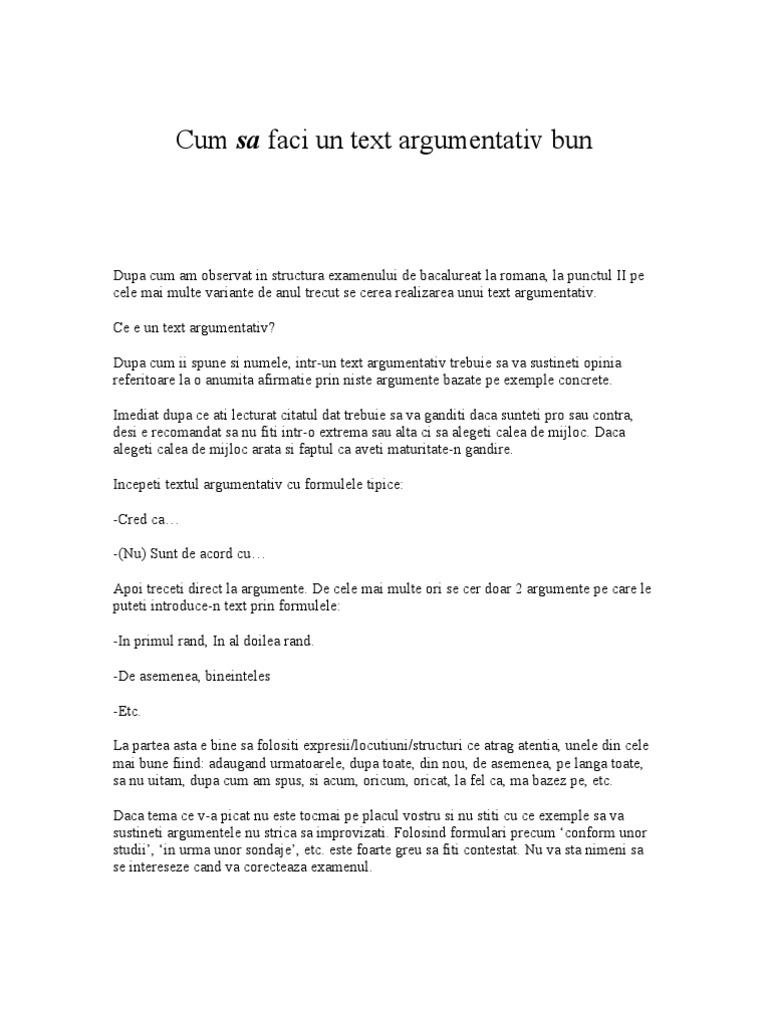 Text argumentativ de nota 10. Azi civilizaţia şi cultura sunt ca douã trenuri ce merg pe linii paralele dar în direcţii opuse. De cele mai multe ori se cer doar 2 argumente pe care le puteti introduce n text prin formulele in primul rand in al doilea rand de asemenea bineinteles etc. Redactarea unui text argumentativ de minimum 150 de cuvinte pe o temd datd avand ca punct de plecare textul suporl. E valabil pentru orice subiect sau examen.