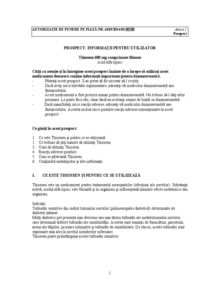 Păstraţi acest prospect. Prospect thiossen 600 mg comprimate filmate. Substanţa activă acidul alfa lipoic este formată şi în organism şi influenţează anumite efecte metabolice din organism. Nu trebuie să folosiţi informaţiile prezente în aceste pagini în scopul diagnosticării sau tratării oricăror probleme de sănătate sau boală sau de înlocuire a medicamentelor a tratamentelor prescrise de persoanalul medical autorizat.