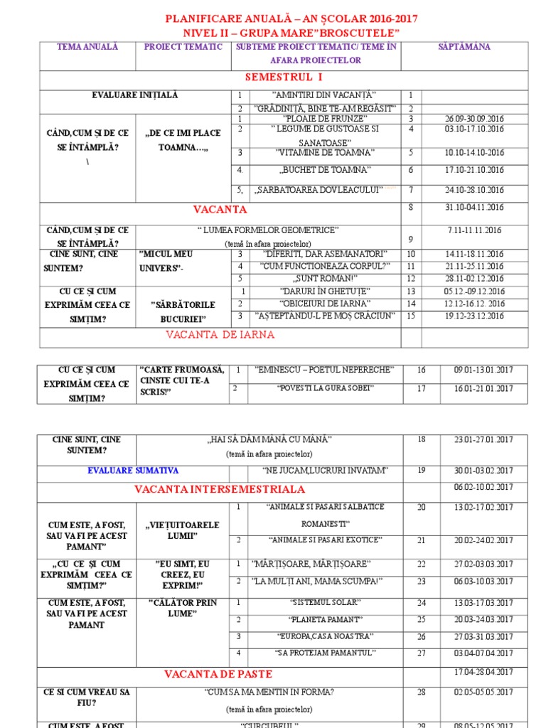 Clasele terminale de liceu vor avea doar 32 de săptămâni şi vor termina școala pe 26 mai 2017 iar cele de clasa a viii a vor avea 34 de săptămâni şi vor încheia pe 9 iunie 2017. Semestrul i 12 septembrie 2016 3 februarie 2017 şi semestrul al ii lea 13 februarie 2017 16 iunie 2017. Am si eu un aspect foarte important de spus. Vacanta de paste 2020 se va desfasura conform structurii anului scolar 2019 2020 in perioada 4 â 21 aprilie.