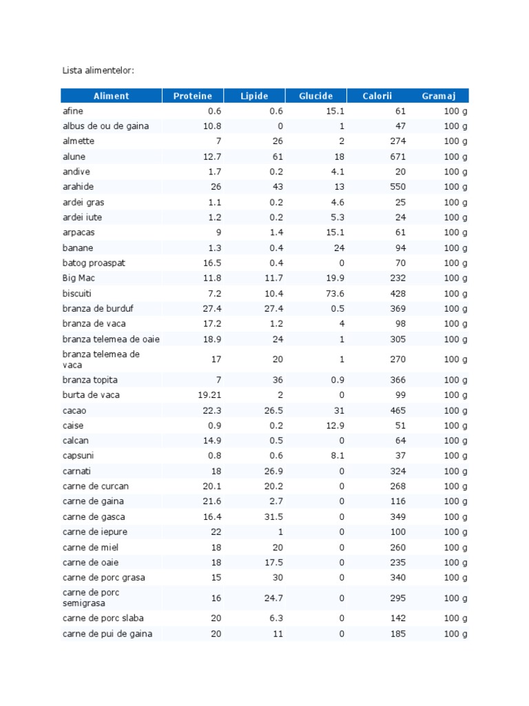 Tabel calorii si tabel cu valorile nutritionale pentru 100g de produs consumat. Cu ajutorul acestui tabel va va fi mult mai usor sa va calculati numarul de calorii zilnice de care aveti nevoie pentru a arde efficient grasimea sau pentru a pune masa muscular.