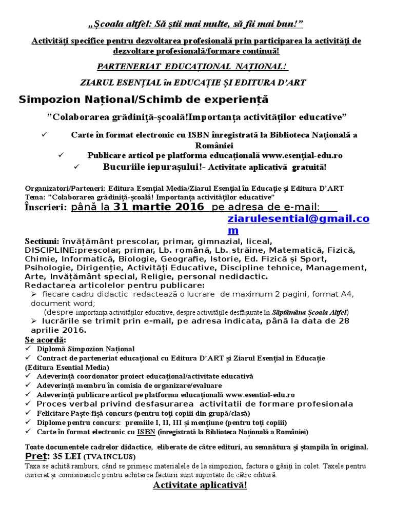 Simpozion National Aprilie 2016 Colaborarea Gradinita Scoala